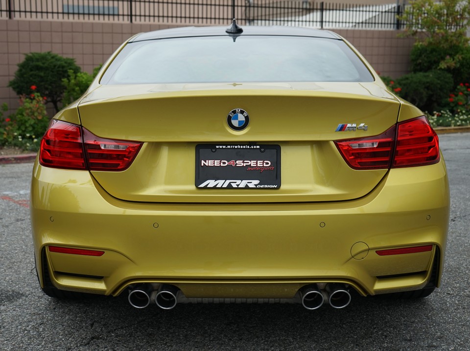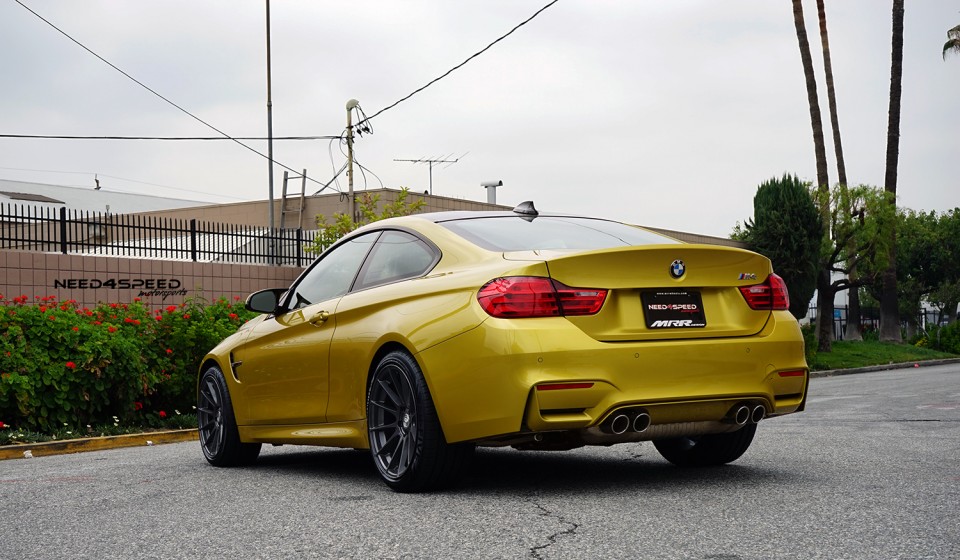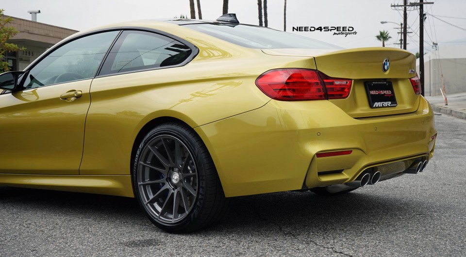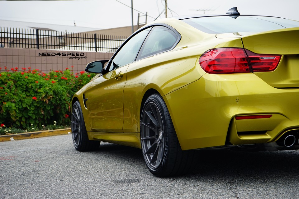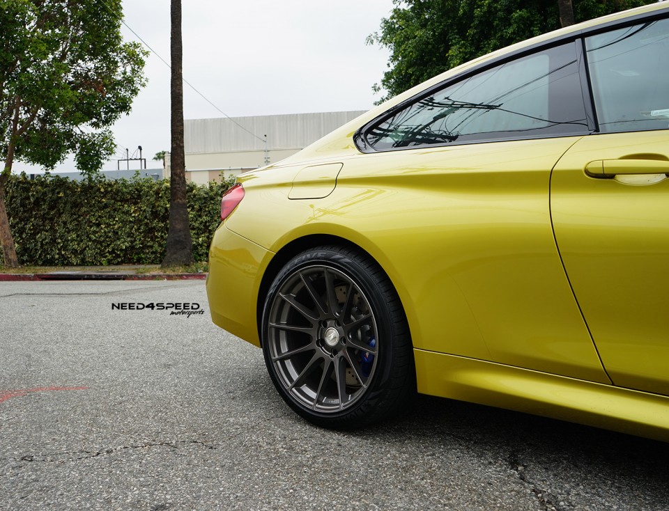 This splendid F82 BMW M4 all wrapped with the Austin Yellow paintjob has received the monoblock multispoke Ground Force GF06 wheels, which is making the sports car looking wider. The wheels are coming in sizes like 19×9.5 at the front, while the rear received the wider 19×10.5 mm wheels. The entire set is wrapped with tires measuring 255/35/19 and 275/35/19 front and rear as well.
